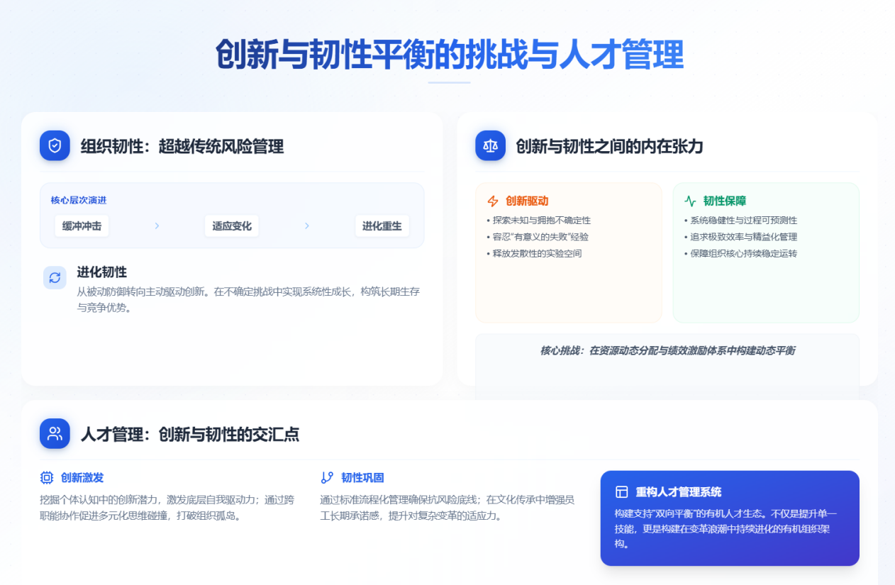 然而,在管理實踐中,追求新質(zhì)生產(chǎn)力與構(gòu)建組織韌性之間,始終存在需要智慧平衡的內(nèi)在張力。創(chuàng)新,本質(zhì)上是探索未知、擁抱風(fēng)險的過程。它要求資源向不確定性領(lǐng)域傾斜,寬容“有意義的失敗”,并允許一定的冗余與發(fā)散空間,以激發(fā)思維的多樣性與技術(shù)的前沿探索。